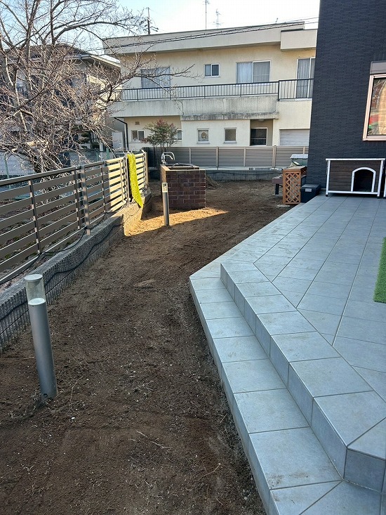 当時は芝生を敷かせていただきましたが、手入れがなかなか大変な事と、ワンちゃんが芝をめくり穴を掘るため、春に向けて人工芝に変更されたいとのご要望でした。
